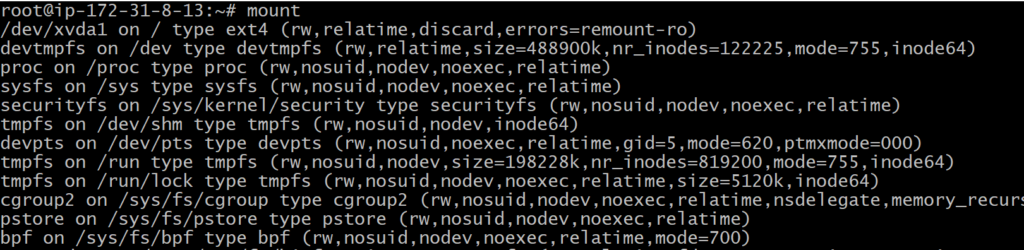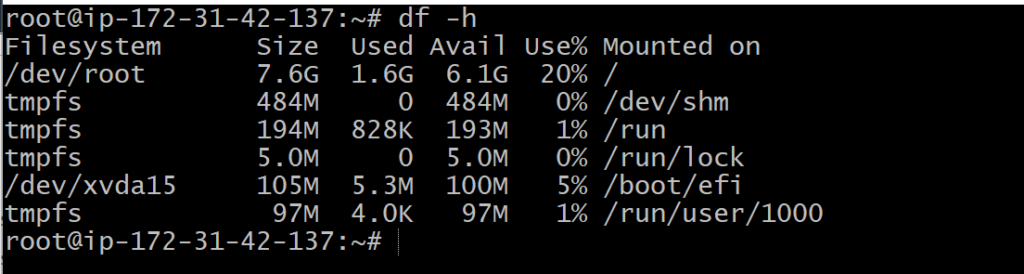 The df command is used to display the disk space used in the file system. It displays the output as in the number of used blocks, available blocks, and the mounted directory.