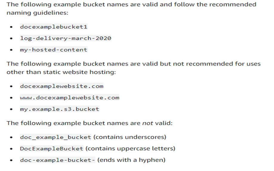 - Bucket names can consist only of lowercase letters, numbers, dots (.), and hyphens (-).