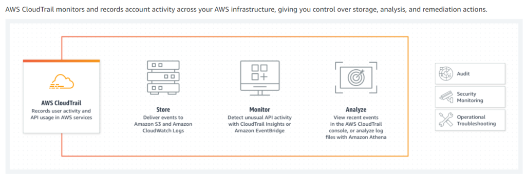 • Trails capture a record of AWS account activities, delivering and storing these events in Amazon S3, with optional delivery to Amazon CloudWatch Logs and Amazon Event Bridge. These events can be fed into your security monitoring solutions. You can use your own third-party solutions or solutions such as Amazon Athena for searching and analyzing logs captured by CloudTrail. You can create trails for a single AWS account or for multiple AWS accounts by using AWS Organizations. AWS CloudTrail Insights analyzes control plane events for anomalous behavior in API call volumes, and can detect unusual activity such as spikes in resource provisioning or gaps in periodic activity.