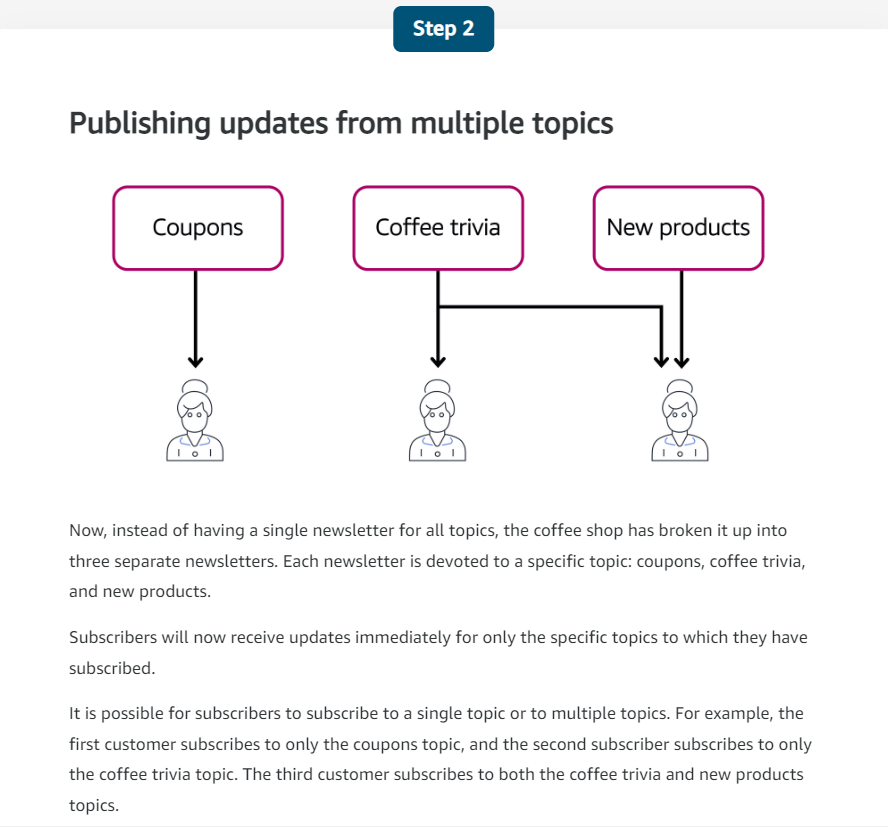Amazon Simple Notification Service (Amazon SNS) is a publish/subscribe service. Using Amazon SNS topics, a publisher publishes messages to subscribers. This is similar to the coffee shop; the cashier provides coffee orders to the barista who makes the drinks.