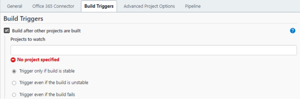 | 1. Trigger only if the build is stable Note: A build is stable if it was built successfully and no publisher reports it as unstable |