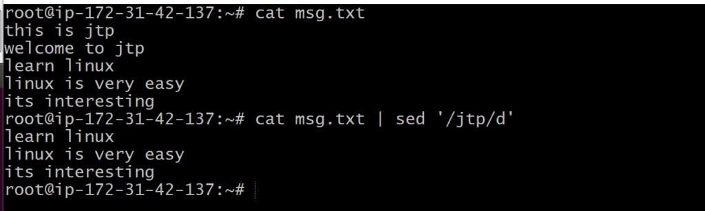 The above command will delete the lines having the word ‘jtp’. Consider the below output: