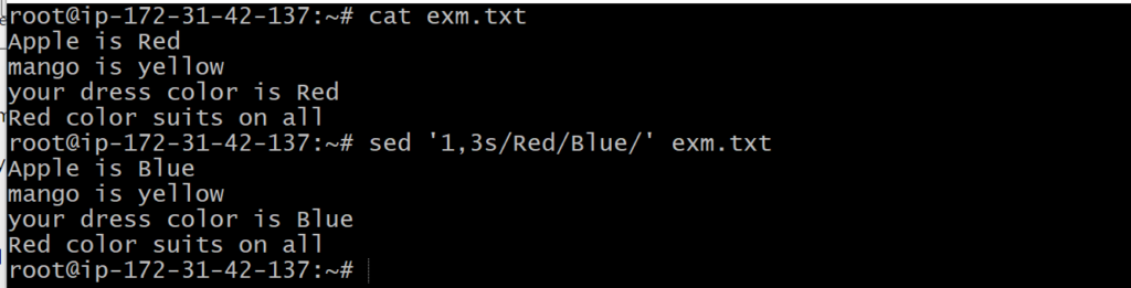 sed ‘1,3s/Red/Blue/’ exm.txt