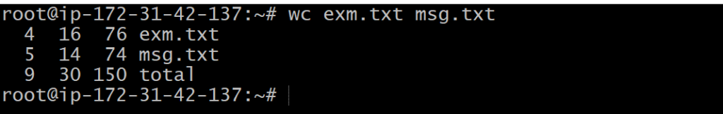 The above command will display the number of words, the number of characters, and the number of the bytes from the files ‘exm.txt’ and ‘msg.txt’. Consider the below output:
