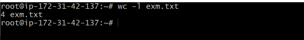 The above command will display the number of lines, number of words, number of bytes, and file name from the file ‘exm.txt’. Consider the below output: