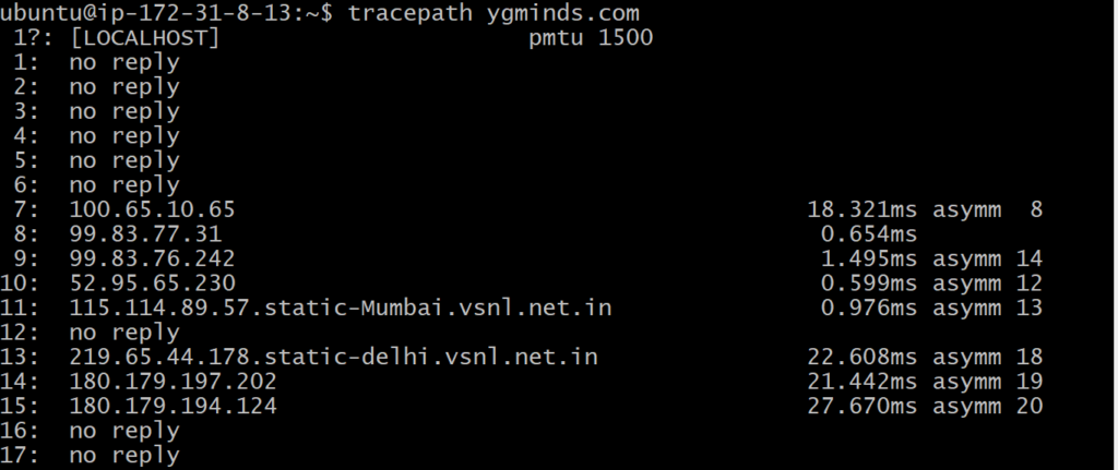 It is similar to traceroute command, but it doesn’t require root privileges. By default, it is installed in Ubuntu but you may have to download traceroute on Ubuntu. It traces the network path of the specified destination and reports each hop along the path. If you have a slow network then tracepath will show you where your network is weak.