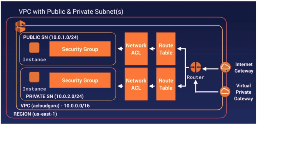 • VPC is a collection of the region, IG, route table, ACL, security group, subnet, instances. You can add all the security matrix-like security groups, etc.