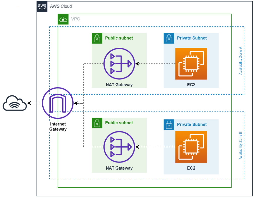 • Each NAT gateway is created in a specific Availability Zone and implemented with redundancy in that zone.