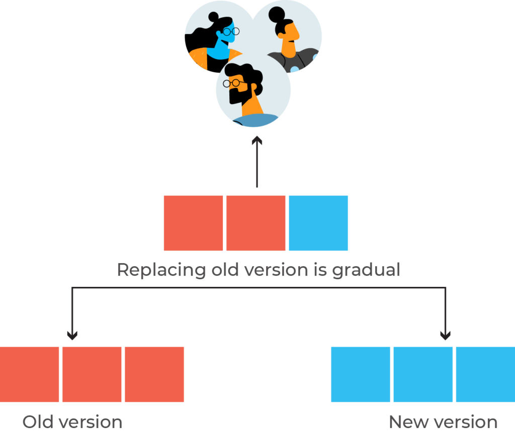 When developers replace all instances of the older version, they shut down the older version. The new version then controls the whole production traffic.